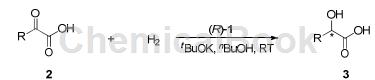 Benzoylformic acid (2a) was used as a model substrate to optimize reaction conditions. The effect of base amount, solvent and ligand on reactivity and reactivity is screened for enantioselectivity. The reaction rate can be accelerated by adding 1.06 equivalents of tBuOK, and complete conversion is obtained within 2 to 75 hours. Solvent screening showed that n-butanol gave the best enantioselectivity. By comparing various chiral SpiroPAP ligands, it was found that the introduction of an alkyl ligand’s pyridine ring at the 6-position reduces the enantioselectivity. However, the presence of an alkyl group at the 3- or 4-position of the pyridine ring can improve the enantioselectivity. Selectivity. Increasing the substrate concentration from 0.4 M to 1.0 M resulted in slightly lower enantioselectivity. Based on the above results, the reaction was optimized. Therefore, the conditions were set as follows: 0.1 mol% of (R)-1c catalyst, 1.06 equivalents of tBuOK as base, nBuOH as solvent (substrate concentration 0.4 M at room temperature). For the more sterically hindered omethylbenzoylformic acid (2c), the hydrogenation was extremely rapid and highly enantioselective. Complete conversion was completed within 1 hour to give 4-methylphenylglyoxylic acid 98% ee.