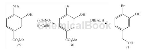 2-Bromo-5-hydroxymethylphenol (71): Suspended in 4-bromo-3-hydroxybenzoic acid methyl ester 70 (6.97g, 30.2mmol) in dichloromethane (360mL) at 0°C Add DIBALH (100 mL, 1M toluene solution, 100 mmol) into the solution in batches. Significant gas evolution was observed. The resulting mixture was warmed to room temperature and stirred for 2.75 hours. After this time, the reaction mixture was quenched by adding saturated aqueous sodium potassium tartrate solution (600 mL) and saturated aqueous ammonium chloride solution (100 mL). The resulting biphasic mixture was stirred vigorously for 2 hours and then extracted with dichloromethane (3x). The organic layer was dried with Na2SO4 and filtered to obtain 71.