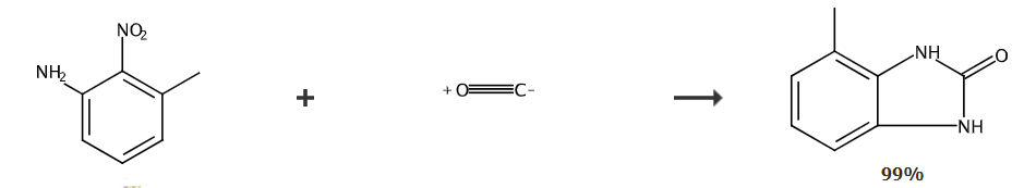 Add 10 mmol of 3-methyl-2-nitroaniline (R in the general formula is an electron-donating substituent), 0.5 mmol of selenium powder, and 10 mmol of triethylamine into a stainless steel autoclave with a volume of 70 ml. and 10g toluene, seal, fill with 3.0Mpa carbon monoxide, put into an oil bath, quickly heat up to 150°C, react under insulation for 4 hours, cool to room temperature, open the kettle, combine the solid obtained by filtration with the solid obtained by concentrating the mother liquor, and dry , the product 4-methylbenzimidazolones was obtained by weighing. The crude reaction product was purified by recrystallization using ethanol as the solvent, and the added amount of the crude reaction product when it was completely dissolved when the solvent was close to the boiling point temperature. The purity is almost 100% and the yield is 99.3%.