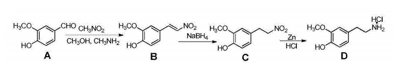 Put vanillin A (30.4, 200 mol) and nitromethane (16.1 ml, 300 mmol) into methanol in sequence, and add 33% methylamine alcohol solution (1.5 ml). Stir the reaction at 50°C for 2 hours. The solution is homogeneous and gradually changes from colorless to dark brown. A large amount of yellow solid appears in 1.5 hours. After TLC detects that the reaction is complete, let it cool and filter with suction. Yellow solid B (33.6g, 172.3mmol) washed with a small amount of methanol. Add B (33.6g, 172.3mmol) prepared in the previous step to 1,4-dioxane (500mL), stir vigorously, and turn into a turbid liquid for later use. In addition, put ethanol (75mL), 1,4-dioxane (300mL), and NaBH4 (32.0g, 845.9mmol) into the eggplant-shaped flask in sequence, and add the reserved suspension dropwise while stirring. liquid, complete the addition in about 1 hour. Stir at room temperature overnight. The solution gradually turns orange-red. Add 250 ml of ice water to the system the next day, adjust the system to weak acidity with glacial acetic acid, transfer it to a separatory funnel, extract with ethyl acetate, wash the organic layer with water and saturated brine, remove the ethyl acetate under reduced pressure, and obtain a brown-red color Oil C (32.0g, 162.4mmol). Add C (8g, 40.6mmol) prepared in the previous step to ethyl acetate, concentrated hydrochloric acid, heat to 70°C, slowly add activated zinc powder (35.0g) under vigorous stirring , 546.5mmol), after the addition is completed, slowly cool to 50°C, react for 3 hours, maintain vigorous stirring during the reaction, and detect by TLC. After the reaction is complete, cool to room temperature, filter, remove excess zinc powder, dry the filtrate over anhydrous sodium sulfate, and then filter and collect The filtrate was concentrated to obtain oily substance 4 (6.7g, 40.0mmol). Add 4M/L hydrochloric acid-methanol solution to oily substance 4, shake it, and place it in a -20°C refrigerator for 2 hours. The solid was precipitated and suction filtered to obtain 2- Methoxy-4-(2-aminoethyl)phenol hydrochloride 6g (reaction yield: about 72%). 1HNMR (400MHz, DMSO) δ9.02 (s, 1H), 6.85 (d, J = 8.2Hz, 1H), 6.69 (d, J = 2.0Hz, 1H), 6.62 (dd , J=8.1, 2.0Hz, 1H), 3.73 (s, 3H), 2.95–2.91 (m, 2H), 2.76–2.72 (m, 2H).