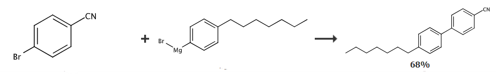 Under nitrogen protection, combine 20 mmol of 4-bromobenzonitrile, 0.2 mmol of palladium acetate, 0.24 mmol of Ph3P and 3 mmol of zinc bromide Dissolve in 30 ml of THF, and then add dropwise 50 ml of Grignard reagent prepared from 20 mmol of 4-n-heptylbromobenzene. After the dropwise addition is completed, react at room temperature for 2 hours. Afterwards, the reaction solution was cooled in an ice-water bath, and then 50 ml of 1% mass dilute brine solution was added dropwise. After the dropwise addition, stir for 30 minutes, separate the organic phase, and extract the aqueous phase twice with 50 ml of ethyl acetate, and combine the organic phases. , and then washed twice with 50 ml of water, and then the solvent was evaporated in a rotary evaporator to obtain the crude product. The crude product was recrystallized from methanol and decolorized with activated carbon to obtain pure 4-heptyl-4′-cyanobiphenyl. Yield: 68.2%.