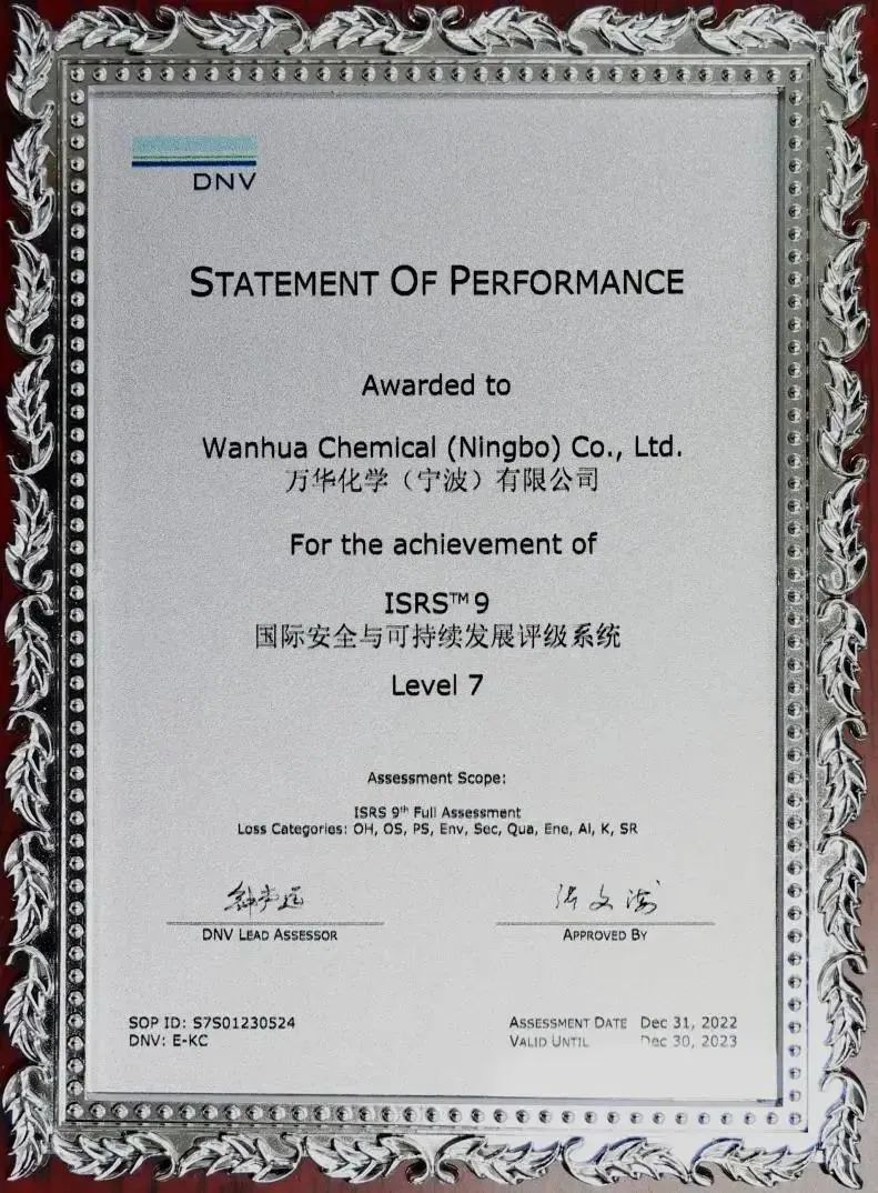 This time, Wanhua Chemical (Ningbo) used the latest ISRS 9th edition standard, which was evaluated by Det Norske Veritas (DNV). From the three aspects of institutional system, safety culture and physical barrier assessment (PBA), the safety leadership Systematic diagnosis of 15 types of management elements such as capacity, risk assessment, human resources, and emergency preparedness, and 10 types of losses such as occupational health, occupational safety, environmental protection, process safety, and quality, showing the maturity of each business process of the enterprise.