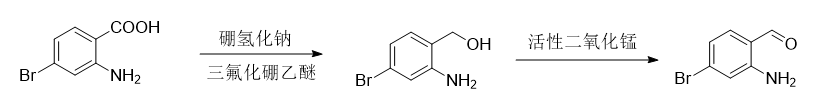 Add 60g of the product obtained in step 1 and 300g of manganese dioxide into 1L of methylene chloride solvent, stir mechanically, and react overnight. Pass the reaction solution through diatomaceous earth and pass through a column (petroleum ether: ethyl acetate = 5:1) to obtain about 40g of 2-amino-4-bromobenzaldehyde [H NMR spectrum (400MHz, CDCl3): δ6.72-6.75(d, 1H), 7.23(bs, 2H), 7.38-7.42(dd, H), 7.72-7.73(d, 1H), 9.77(s, 1H)]. The yield is 85.2%.