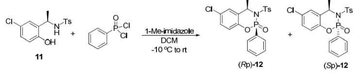 Cool a solution of 11 (100.0 g, 307.7 mmol) in anhydrous dichloromethane (1200 mL) to -10°C and add PhP(O)Cl2 (57.6 mL, 369.2 mmol, 90 wt%, 1.2 equiv) followed by addition of 1-methylimidazole (61.0 mL, 769.2 mmol, 2.5 equiv) over 30 min while maintaining the internal temperature <-5 °C under argon. The reaction mixture was stirred at -10°C to -5°C for 30-60 minutes to complete the reaction. Water (500 mL) was added to quench the reaction. The organic phase was washed with 400 mL 1N HCl and 100 mL water, and then with 200 mL saturated NaHCO3 aqueous solution. The organic portion was filtered through celite and concentrated. The residue was recrystallized using EtOAc:hexane (500 mL:1200 mL) to afford (RP)-12 (117.0 g) as a white solid in 85% yield and >99.5:0.5dr selectivity.