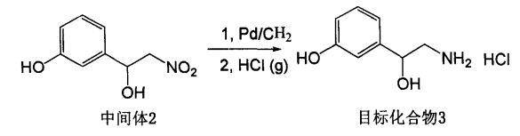 Add 200 mg of the intermediate product 3-(1-hydroxy-2-nitro)ethylphenol, 1.09 mmol, into a 25 ml single-neck bottle, dissolve it in 15 ml of anhydrous methanol, add 20 mg of palladium on carbon catalyst, and hydrogenate at room temperature and normal pressure. Catalytic hydrogenation, stirring for 10 hours, filtering through diatomaceous earth, and concentrating the filtrate to obtain 158 mg of crude product with a yield of 95%. Dissolve the crude product in dry ethyl acetate and pass in dry hydrogen chloride gas to form a salt to obtain the target compound (+)-detoluene. Folin hydrochloride.