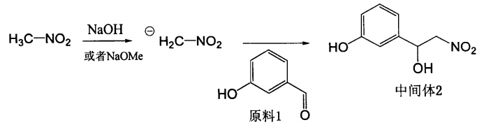 Add 5 ml of methanol into a 50 ml single-neck bottle, cool to 0°C, add 0.75g of metallic sodium, and stir until dissolved to obtain sodium methoxide. Slowly add 10 ml of nitromethane dropwise at 0°C. After the drop is completed, stir at 0°C for 15 seconds. Minutes, a light yellow negative ion suspension is formed, then dissolve 1.0g, 8.2mmol of m-hydroxybenzaldehyde in 10ml nitromethane, slowly add dropwise to the negative ion suspension, slowly rise to room temperature, stir overnight, add saturated ammonium chloride The reaction was terminated with the solution, and the reaction solution was extracted with ethyl acetate. The organic phases were combined, washed with saturated brine, dried over anhydrous sodium sulfate, concentrated to obtain a light yellow oily substance, and purified by column chromatography to obtain a light yellow solid intermediate product 3- (1-Hydroxy-2-nitro)ethylphenol 1.104g, yield 73.6%, or 79.3% based on actual utilization of raw materials, and 72 mg of unreacted raw materials were recovered.