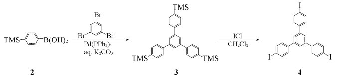 Dissolve intermediate 3 in 100 mL of dichloromethane, slowly add iodine chloride (ICl, 4.05 g, 25 mmol) in dichloromethane solution (20 mL) dropwise under nitrogen protection, complete the addition, and react at room temperature for 24 hours. , the reaction solution was washed with a 5% mass fraction of sodium thiosulfate solution, the organic layer was separated, dried with anhydrous MgSO4, concentrated, and column chromatographed (CCl4 (as eluent), recrystallized in carbon tetrachloride to obtain 2.87g of light yellow powder 1,3,5-tris(4-iodophenyl)benzene, yield 42%, m.p.268~271℃.IR ( KBr),ν/cm-1):3033,1593,1483,1437,1377,1243,1061,1003,886,810.1HNMR(CDCl3 ), δ:7.39(dd,6H,J=2.0Hz,J=8.4Hz),7.67(s,3H),7.80(dd,J=2.0Hz,J=8.4Hz,6H).