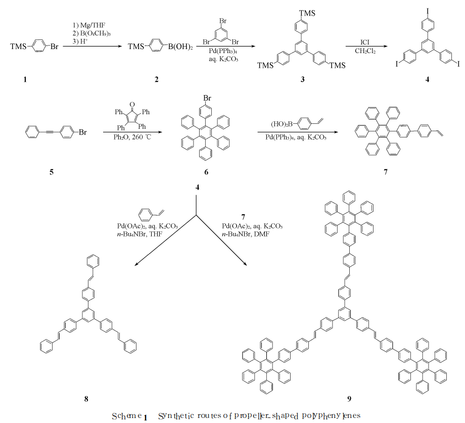 Cheng Ge et al. used 4-vinylbiphenyl as the bridge structure and 1, 3, 5-tris(4-iodophenyl)benzene (4) as the central core through Heck coupling catalyzed by transition metal palladium. The reaction constructs a blue luminescent paddle-shaped molecule (9) containing hexaphenylbenzene structural unit (see Scheme 1 for the synthesis route); for 4-vinylbiphenyl (VBP) as a bridge structure, the “arm” structure of the paddle-shaped molecule In unit 7, the photoluminescence properties of the parent skeleton molecule 1, 3, 5-tris(4-styrylphenyl)benzene (8) and paddle-shaped molecule 9 were studied. Research results show that the paddle-shaped molecule has two luminescent centers, and the maximum emission wavelengths are 397 and 445 nm respectively in the blue light range.