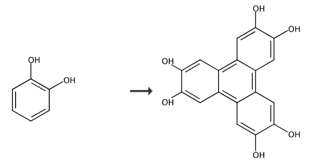 Catechol (20g, 0.182mol) and hexahydrate/ferric (III) chloride (196.8g, 0.728mol) were reacted using ultrasound for 24 hours. After the reaction is completed, the mixture is washed with dilute hydrochloric acid and water, and extracted with heated cyclopentanone to obtain 2,3,6,7,10,11-hexahydroxytriphenyl. 1H NMR (600MHz, CDCl3) δ7.82 (s, 6H), 5.35 (s, 6H)
