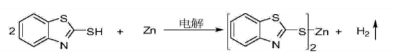 Add 30 mL of methanol into the electrolytic cell, add 0.5 g of 2-mercaptobenzothiazole with a purity of 98%, then add 0.1 g of conductive agent tetrabutylammonium bromide, stir and dissolve thoroughly under 35°C water bath heating conditions. The stirring speed of the electrolytic cell is 200 rpm, the anode is a metal zinc sheet, and the cathode is graphite. Direct current is passed through the reaction and the current during the reaction is adjusted to 60 mA. TLC tracks the reaction progress, and the electrolysis reaction continues until 2-mercaptobenzothiazole disappears in the electrolytic cell to obtain a suspension. Filter, and the filtrate obtained is returned to the electrolytic cell for continued use. The filter cake is washed with methanol (5mLx3) and dried to obtain a solid product, 2-mercaptobenzothiazole zinc salt, with a yield of 99.3%. X-ray powder diffraction of the sample shows that the interplanar spacing d=1.32999, 0.96207, 0.89702, 0.73719, 0.65067, 0.56519nm is attributed to the characteristic peak of bis-2-mercaptobenzothiazole zinc.