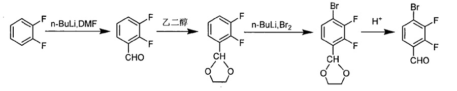 3) Take 1000g of the intermediate 2,3-difluorobenzaldehyde ethylene glycol, 5000mL of tetrahydrofuran, replace it with nitrogen three times, and when the temperature drops to 65℃, start adding 2500mL of n-butyllithium (2.5M/L ), finish dripping within 2 hours. After 0.5 hours of heat preservation, start dripping 1000g of liquid bromine and finish dripping within 1 hour. After completion, naturally raise the temperature to -30°C, pour into water to quench, and add an appropriate amount of sodium thiosulfate to the KI test paper No color develops. After 10 minutes of reaction, the intermediate 4-bromo-2,3-difluorobenzaldehyde ethylene glycol is obtained after washing with water and distilling to remove the solvent;