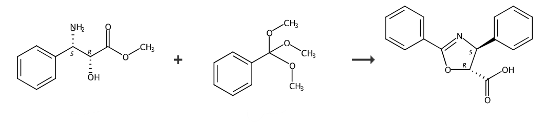 Dissolve (2R,3S)-3-phenylisoserine (2.87g, 0.013mol) in 50ml of dry toluene, increase the temperature to 110°C, and then add trimethyl orthobenzoate (5ml, 0.029 mol), after 8 hours of reaction, the raw material disappeared completely according to TLC. The solvent was evaporated under reduced pressure, and the initial product was slowly separated by column chromatography (thin layer chromatography on silica gel, petroleum ether: ethyl acetate = 8:1) to obtain a white product (4S, 5R)-2,4-diphenyloxane. Azole-5-carboxylic acid methyl ester, yield 66%. 1H NMR (200MHz): δH 3.90 (3H s), 4.96 (1H, d, J = 6.5Hz,), 5.50 (1H, d, J = 6.5Hz,), 7.30-7.62 (8H,m),8.10-8.20(2H,m);13C NMR (CDCl3,50MHz): δC 52.68,74.59,83.07,126.39,126.72, 127.97,128.15,128.22,128.39,128.64,128.79,131.86,141.04,163.89,170.55.