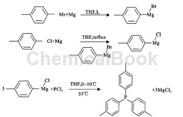 The synthesis route of tris(p-tolyl)phosphine is divided into two steps: Step (1), preparation of Grignard reagent. Since the initiation of Grignard reagent for p-chlorotoluene is difficult, Grignard reagent is the best In this article, the Grignard reagent of p-bromotoluene is used as the initiator (p-bromotoluene and magnesium chips are used as raw materials, tetrahydrofuran is used as the solvent, iodine is used to initiate the reaction, and about p-methylphenyl magnesium bromide is synthesized as the initiator. Initiate the synthesis of p-methylphenyl magnesium chloride from p-chlorotoluene). The synthesis route of the initiator p-methylphenyl magnesium bromide is shown in formula (1). Then use p-methylphenyl magnesium bromide as the initiator, and use p-chlorotoluene , magnesium chips as raw materials, tetrahydrofuran as solvent, prepare Grignard reagent p-methylphenylmagnesium chloride, the reaction route is shown in formula (2). Step (2), preparation of tris(p-tolyl)phosphine. Put step (1) The nucleophilic reaction between p-methylphenylmagnesium chloride prepared in the step and phosphorus trichloride is used to prepare tris(p-tolyl)phosphine. The synthesis route is shown in formula (3).