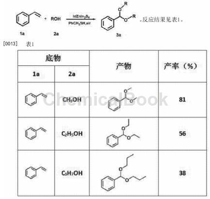 CN201811481556 reports a method for synthesizing aromatic acetals from styrene under visible light. 8-10mg of the catalyst Ir/ZnIn2S4 is added to the reaction tube, and a certain proportion is added of styrene and mercaptan (the molar ratio of styrene to mercaptan is 1.2:1-1:1) and 4 ml of alcohol, and then irradiate the reaction tube under normal temperature, normal pressure, air atmosphere, and visible light for 8-15 hours. Thiols generate thiol radicals under the action of catalyst Ir/ZnIn2S4 and visible light. The generated thiol radicals react with styrene to generate alkyl radicals, and generate peroxy radicals under the action of O2 in the air, and then generate Peroxyl radicals react with alcohol to eventually form acetal. The method does not require the addition of protonic acid or Lewis acid, and the reaction time is 8-15 hours. The reaction formula is as follows: