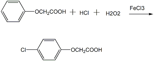 Using phenoxyacetic acid, concentrated hydrochloric acid and 36.05% hydrogen peroxide as raw materials, they react under the catalysis of ferric chloride to generate p-chlorophenoxyacetic acid. The reaction equation is: