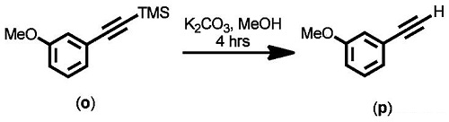 2) To a solution of the compound of step 1) (6g, 29.6mmol, 1eq) in MeOH (40mL) was added K2CO3 (2g, 14.8mmol, 0.5eq). After stirring at room temperature for 4 h, the mixture was diluted with Et2O and washed with H2O (3 × 50 mL). The organic extracts were dried over MgSO4 and concentrated under reduced pressure. The product 3-ethynyl anisole was obtained in a pale yellow oil. Yield: 3.5g, 90%. 1HNMR (400MHz, CDCl3): δ7.21 (t, J=8.0Hz, 1H), 7.08 (d, J=7.8Hz, 1H), 7.00 (d, J=7.8Hz, 1H), 6.79 (d, J =7.8Hz, 1H), 3.86 (s, 3H), 3.08 (s, 1H).