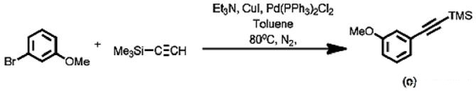 1) To 3-bromoanisole (5mL, 39.5mmol, 1 equivalent), triethylamine (22mL, 158mmol, 4 equivalents), CuI (0.75g, 4.0mmol, 10mol%) were added to toluene (50mL) Pd(PPh3)2Cl2 (1.4 g, 2.0 mmol, 5 mol%) in (trimethylsilyl)acetylene (6 mL, 43.5 mmol, 1.1 equiv). The reaction mixture was stirred at 80 °C for 5 h, then diluted with EA and washed with H2O (3 × 50 mL). The organic extracts were dried over MgSO4 and concentrated under reduced pressure. The crude product was purified by flash chromatography on silica gel using n-hexane/ethyl acetate (10:1) as eluent to give a colorless oil. Yield: 6.0g, 75%. 1HNMR (400MHz, CDCl3): δ7.20 (d, J=8.0Hz, 1H), 7.06 (d, J=8.0Hz, 1H), 6.99 (d, J=6.7Hz, 1H), 6.87 (d, J =8.0Hz, 1H), 3.75 (s, 3H), 0.19 (s, 9H).