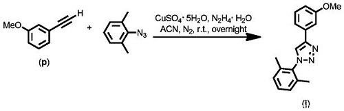To a solution containing 3-ethynyl anisole (1.63g, 13.2mmol, 1.5eq), CuSO4·5H2O (0.22g, 0.88mmol, 0.1eq) and hydrazine hydrate (0.28mL, 8.8mmol, 1eq) 2-azido-1,3-dimethylbenzene (1.30 g, 8.8 mmol, 1 equivalent) was added to acetonitrile (50 mL). The mixture was stirred at room temperature under N2 atmosphere for 12 hours. The mixture was then diluted with dichloromethane and washed with H2O (3 × 50 mL). The organic extracts were dried over MgSO4 and concentrated under reduced pressure. The crude product was purified by flash chromatography on silica gel using n-hexane/ethyl acetate (10:1) as eluent to give a colorless oil. Yield: 1.7g, 71%. 1HNMR (400MHz, CDCl3): δ7.93 (s, 1H), 7.64 (s, 1H), 7.51 (d, J=6.6Hz, 1H), 7.43 (d, 8.0Hz, 1H), 7.38 (s, 1H ), 7.30–7.25 (m, 2H), 7.00–6.95 (m, 1H), 3.96 (s, 3H, -OMe), 2.12 (s, 6H).