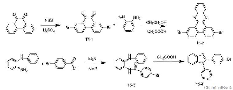 3) Synthesis of compounds 15-3 and 15-4: Add N-phenyl-1,2-phenylenediamine (9.2g, 50mmol) and NMP (80ml, N-methylpyrrolidone) in the flask, Then 4-bromobenzoyl chloride (10.9g, 50mmol) was added and the reaction was stirred at room temperature overnight. After the reaction, pour the reaction solution into water. A large amount of solid will precipitate. Filter. The filter cake is recrystallized with THF (tetrahydrofuran) and methanol. The obtained white solid (compound 15-3) is added to acetic acid (100 ml) and heated to reflux for 12 hours. The reaction proceeds. After completion, the solvent was removed under reduced pressure, methanol (50 ml) was added, and filtered to obtain 12 g of white solid (compound 15-4) with a yield of 69%. Among them, the NMR of 15-4 is: