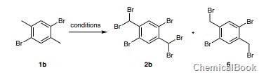 Bromination of 1b with NBS (4.4 equivalents) and AIBN (4 mol%) in refluxing ethyl acetate using a 100W incandescent lamp for 16 hours gave the symmetrical dibromide product 1,5-dibromo-2,4-di Bromomethylbenzene (6). Further increase in the amount of NBS to 8.8 equivalents and reaction time to 48 hours did not result in the formation of bis(dibromo) product 2b.
