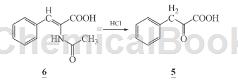2) Add 1600 mL (1 mol/L) hydrochloric acid to the reaction bottle, add nitrogen, add 100g (0.487 mol) α-acetylaminocinnamic acid (6) under stirring, complete the addition, raise the temperature to reflux, react 3 h, filter while hot to remove oily impurities, and the filtrate will crystallize after cooling. Precipitate α-ketophenylalanine (5), filter with suction, and dry the filter cake naturally to obtain 65.3 g of light yellow needle crystal solid ketone α-phenylalanine (5), with a yield of 81.6% (document conversion rate 50 %), m.p.157~158℃ (literature value m.p.157℃).