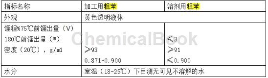 The main components of crude benzene are all distilled before 180°C, and the outflow after 180°C is calculated as 100%. Therefore, the distillation amount before 180°C is used as one of the indicators to identify the quality of crude benzene. . The amount of crude benzene distilled before 180°C depends on the process flow and operating system of the crude benzene section. The more distillation volume before 180℃, the better the quality of crude benzene. Generally, the distillation volume of crude benzene before 180℃ is required to be 91%-93%. The quality index of crude benzene is as follows.