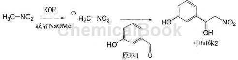 a. Use sodium methoxide or potassium hydroxide as the base, slowly add nitromethane dropwise at 0°C, stir for 15-60 minutes at 0°C to form a light yellow negative ion suspension, and then add m-hydroxybenzaldehyde first After being dissolved in nitromethane, slowly add dropwise to the suspension, raise to room temperature, stir, add saturated ammonium chloride solution to terminate the reaction, extract the reaction solution with ethyl acetate, combine the organic phases, wash with saturated brine, and filter with anhydrous After drying over sodium sulfate and concentrating, a light yellow oil was obtained, which was purified by column chromatography to obtain a light yellow solid intermediate product 3-(1-hydroxy-2-nitro)ethylphenol. The reaction formula is: