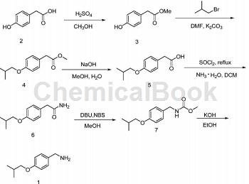 Using 4-hydroxyphenylacetic acid (2) as raw material, esterification reaction produces 4-hydroxyphenylacetic acid methyl ester (3); (3) substitution reaction produces 4-isobutoxyphenylacetic acid methyl ester (4) ), the obtained product (4) is hydrolyzed to obtain 4-isobutoxyphenylacetic acid (5); (5) undergoes acylation reaction to produce 4-isobutoxyphenylacetamide (6); (6) is reacted by Hofmann Furman) degradation reaction generates N-(4-hydroxybenzyl) methyl carbamate (7); (7) is hydrolyzed to obtain the target product (1).