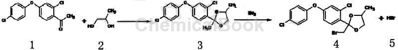 1) Preparation of difenoconazole bromide ketal. Difenoconazole is a new high-efficiency fungicide with a broad bactericidal spectrum. It is effective against Ascomycetes, Basidiomycetes and other species including Alternaria, Ascospora, and Cercospora. Deuterospora, Acanthosporium, Coccidioides, Phytophthora, Cylindrospora, Septoria, and Black Star, Powdery mildewaceae, Pucciniales and some Seed-borne pathogens have long-lasting protective and therapeutic effects. It is also very effective against grape anthracnose and white rot. Specifically, phenylene ether ketone is used as raw material, and the key intermediate of difenoconazole, a new high-efficiency fungicide, is obtained through cyclization reaction and bromination reaction.