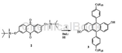 Step 1: Add 2,6-dihydroxyanthraquinone (80.0g, 0.33mol), imidazole (108.8g, 1.6mol), tert-butyldimethylsilyl chloride (115.5 g, 0.77mol) and DMF. 600ml. The dark red mixture was heated to 90°C for 3 hours. TLC indicated the reaction was complete. The reaction was cooled and poured into 2L cold water. The dark green needle-like precipitate was filtered off and washed with water and methanol. Dissolve the dark green crystals in ether and filter out the black insoluble portion. The bright yellow filtrate was concentrated and the crude product was suspended in boiling methanol. The yellow precipitate was filtered to obtain 85.1g of pure product in the form of yellow filamentous crystals with a yield of 54%. 1HNMR (CDCl3) δ (ppm): 0.28 (s, 12H), 1.00 (s, 18H), 7.14 (dd, J1=8.5Hz, J2=2.5Hz, 2H), 7.64 (d, J=2.5Hz, 2H ), 8.17 (d, J=8.5Hz, 2H). 13CNMR (CDCl3): -4.36, 25.53, 117.35, 125.34, 127.57, 129.73, 135.73, 161.26, 182.17. Melting point 131-133℃. FD-MS: m/z468 (M+).