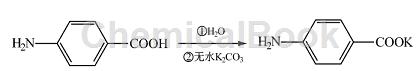 Add 50 mL water and 3g (0. 022 mol) para-aminobenzoic acid into a 100 mL round-bottomed flask, stir well, slowly add 1. 5g (0. 011 mol) anhydrous potassium carbonate, and adjust The pH is about 8. The reaction is stirred for 1 hour, and the impurities are removed by filtration to obtain potassium p-aminobenzoic acid.