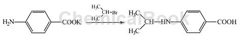 Add 2.5 g (0.02mol) 2-bromopropane to the prepared potassium p-aminobenzoic acid salt solution, and heat and reflux for 12 hours until the 2-bromopropane in the lower layer basically disappears, and a small amount of solid precipitates. After cooling, a large amount of solid precipitated. The solid was filtered out and recrystallized with isopropyl alcohol (added activated carbon for decolorization) to obtain white crystals, which were dried to obtain 1.5 g of the product 4-(N-isopropylamino)-benzoic acid. Rate 51%, m p 160~161°C, IRυ max /cm1: 3408 (N-H stretching), 3200 (-OH), 2970 (C-H stretching, 1720 (C=O), 1525, 1580, 1600 (benzene ring), 1379, 1384 (bimodal, isopropyl), 837 (para-substituted benzene ring).