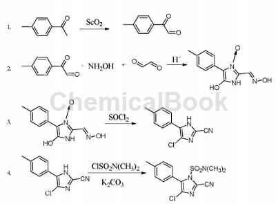 CN201410165615.X provides a method with short reaction cycle and simple post-processing, suitable for batch industrial production of 4-chloro-2-cyano-N,N-dimethyl-5-(4-methylphenyl)-1H -Method of imidazole-1-sulfonamide. The synthetic route provided by the present invention is as follows: