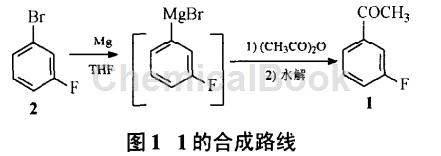 Zhao Haoyu reported that after using m-bromofluorobenzene (2) and magnesium wire to prepare Grignard reagent, 3′-fluoroacetophenone, namely compound 1 (Figure 1), was obtained through acetylation and hydrolysis. Conditions such as ratio, solvent dosage, reaction time and temperature were optimized. When preparing Grignard reagent, adding a little iodine first can significantly shorten the reaction induction period; the dropwise addition and total reaction time of 2 should be controlled at 4h and 6h respectively, because although extending the reaction time is beneficial to improving the conversion rate of raw materials, it is easy to form benzene rings. of dimer by-products. Experiments show that the amount of solvent is closely related to the yield. When the concentration of 2 in THF is lower than 2.1 mol/L, the conversion rate is higher. The optimal conditions determined are: using THF as the solvent, the feeding ratio is 2: magnesium wire: acetic anhydride = 1:1:1.1 (molar ratio), react at 40~45°C for 4 hours, then raise the temperature to 55~65°C before reacting 2h, acetylation at 0~5℃ for 30min, the total reaction yield is 55%, and the purity is 99.1% (GC method).