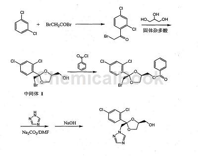 cis 2 (2,4 dichlorophenyl) 2 ([1,2,4] triazole 1 methyl) [1,3]dioxolane 4 Methyl methanesulfonate is very difficult to synthesize because it involves a stereoscopically active structure. At present, the international synthesis process mainly uses dichloroacetophenone as the raw material, which is brominated, catalyzed by concentrated sulfuric acid, condensed with glycerol and then esterified. The bromoester is obtained and then reacted with 1,2,4 triazine under the catalysis of sodium methoxide. Azole condensation, hydrolysis, column chromatography separation of isomers to obtain cis-alcohol, and then esterification with methanesulfonyl chloride to obtain methanesulfonic acid active ester; or using bromo ester with 1,2,4 triazine under the catalysis of sodium hydride Azole condensation, hydrolysis, column chromatography separation of isomers to obtain cis-alcohol, and then esterification with methanesulfonyl chloride to obtain methanesulfonic acid active ester.