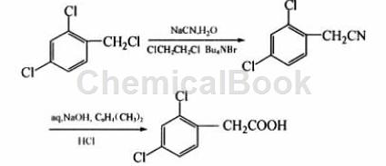 2,4-Dichlorophenylacetic acid is a key intermediate for the new insecticide and acaricide spirodiclofen. Spirodiclofen is a low-toxic miticide with a new structure developed by the company. It has contact killing and stomach poisoning effects, but has no systemic activity. It has a broad spectrum of killing mites, long lasting effect, and kills both eggs and young mites. Spirobifen mainly inhibits the fat synthesis of mites and blocks the energy metabolism of mites. It is effective for all developmental stages of mites. It has outstanding ovicidal activity and has no cross-resistance with existing acaricides. It is suitable for use in Control harmful mites that are resistant to existing acaricides. There is research and development of a preparation method for spirodiclofen and its intermediates. 3-(2,4-Dichlorophenyl)-2-oxygen is prepared in one step using methyl hydroxycyclohexylcarboxylate, 2,4-dichlorophenylacetic acid, and the action of phosphorus oxychloride or phosphorus trichloride. Generation-1-oxaspiro[4,5]dec-3-en-4-ol is finally reacted with 2,2-dimethylbutanoyl chloride to obtain spirodiclofen. This process has short reaction time, low reaction temperature, and the yield can be increased by more than 10% (based on 2,4-dichlorophenylacetic acid). This route is suitable for industrialization. Its synthesis route is as follows: