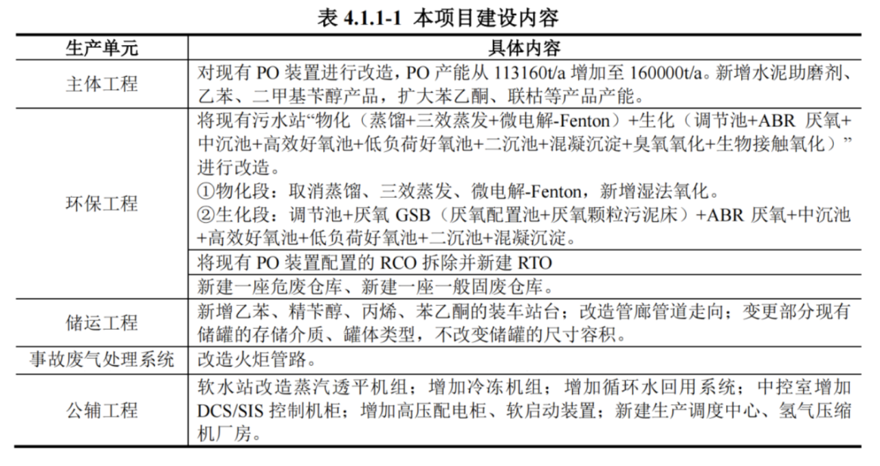 Adjusted construction content: The construction goal of this project is to expand the production capacity of the existing 100,000 tons/year propylene oxide unit to 160,000 tons/year through technical transformation, including the main propylene oxide unit, sewage Treatment station, 1# power transformation and distribution station, soft water station/air compressor station, circulating propylene compressor workshop, tank farm, loading and unloading platform, oxidation air compressor room, circulating water station, central control room, hazardous waste incinerator system, Modification of the flare system, overhead pipe gallery, etc., as well as the construction of a new production dispatch center, hydrogen compressor factory building, 2# hazardous waste warehouse, general solid waste warehouse equipment, RTO tail gas treatment, etc. Compared with the original plan, the renovation content increased and the investment increased.