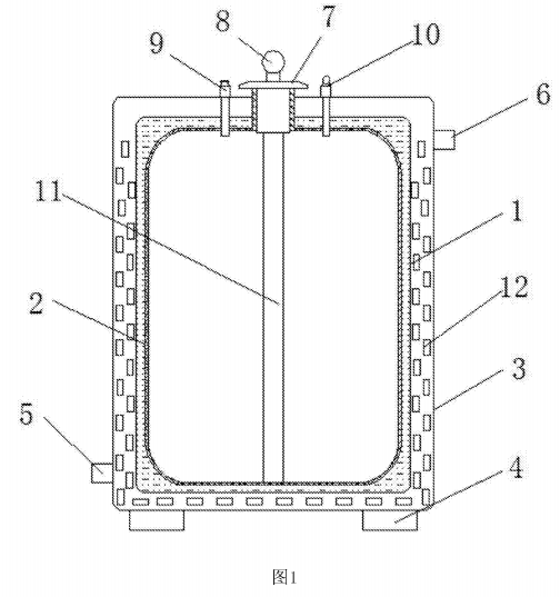 Figure 1 is a rendering of the overall structure of the utility model; in the figure: 1-inner tank, 2-plastic film, 3-outer tank, 4-balance foot pad, 5-water inlet pipe, 6-water outlet pipe, 7- Top cover, 8-pressure gauge, 9-pressure relief valve, 10-thermometer, 11-extension tube, 12-ice crystal.