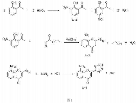 CN201410229357.7 provides a synthetic method for preparing 8-nitro-2-tetrazolyl-4-carbonylbenzopyran from 2′-hydroxyacetophenone, aiming to simplify the operation, reduce costs, and improve The reaction yield is high and it is easy to realize industrial production. The object of the present invention is achieved through the following technical solutions: the synthesis method of 8-nitro-2-tetrazolyl-4-carbonylbenzopyran, using o-hydroxyacetophenone as the starting material, first nitrating with nitric acid , to generate a mixture of 2-hydroxy-3-nitroacetophenone and 2-hydroxy-5-nitroacetophenone, which is then separated and purified by salt formation with an inorganic base, and then hydrolyzed with acid to obtain 2-hydroxy-3-nitroacetophenone. Nitroacetophenone (A-2); 2-hydroxy-3-nitroacetophenone (A-2) undergoes cyclization reaction with ethyl cyanoformate to generate 8-nitro-2-cyano-4 -Carbonylbenzopyran (A-3), finally reacts with sodium azide to form 8-nitro-2-tetrazolyl-4-carbonylbenzopyran (A-6).