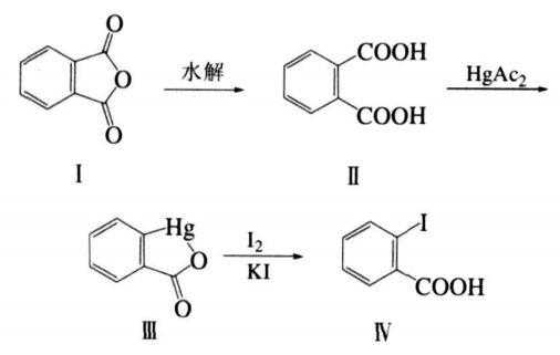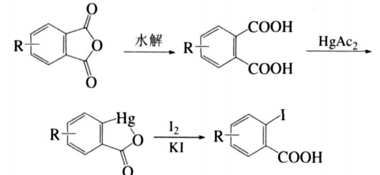 Yang Yiheng et al. designed and implemented another synthesis route, that is, directly using cheap phthalic anhydride or phthalic anhydride derivatives as raw materials, o-iodobenzoic acid and its derivatives can be synthesized through the three-step reaction of hydrolysis, mercury substitution and iodo substitution. The structure of the product was confirmed by melting point, 1HNMR and IR characterization. The synthesis route is as follows: