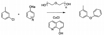 Stir and mix 3-chlorotoluene, sodium phenolate, cuprous chloride, 8-hydroxyquinoline and polydiethylene glycol at room temperature in a reaction vessel, and heat until the temperature of the mixture is 130~140°C, then keep it warm and stir The reaction lasts for 8 to 9 hours, and finally, through high vacuum and reduced pressure distillation, the 100 to 110°C fraction is taken to obtain m-phenoxytoluene. The reaction equation is as follows. In this reaction, sodium phenolate and 3-chlorotoluene are used as raw materials, and m-phenoxytoluene is reacted in the next step under the action of a catalyst. m-chlorotoluene is both a reactant and a solvent.
