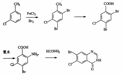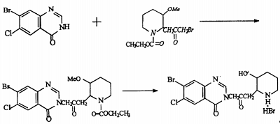 Hydroxanone hydrobromide is 7-bromo-6-chloro-3-[3-(3-hydroxy-2-piperidinyl)-2-oxopropyl]-4(3H)-quinolinone , a natural alkaloid, was first used as a veterinary drug and has unique effects in fighting poultry coccidiosis. Using 3-chlorotoluene as raw material and ferric chloride as catalyst, it undergoes bromination reaction with butane bromide and bromine to obtain 2,4-dibromo-5-chlorotoluene, which is produced by potassium permanganate, potassium dichromate or dichromate. Magnesium oxide converts the methyl group into a carboxyl group to obtain 2,4-dibromo-5-chlorotoluic acid. It reacts with ammonia water or ammonia gas in the presence of cuprous chloride to selectively ammonate its ortho-bromine to obtain 2- Methyl-4-bromo-5-chlorobenzoic acid is then cyclized in DMF solution using formamide to obtain 7-bromo-6-chloro-4(3H)-quinolinone, which is finally combined with 2-bromoacetonyl-3- Methoxy-1-piperidinecarboxylic acid ethyl ester is condensed, hydrolyzed, and demethylated to obtain oftenanone hydrobromide. The reaction process is as follows.