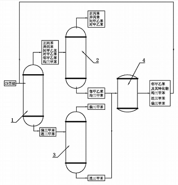 C9 aromatics are by-products during crude oil processing, mainly from the reforming unit and cracking unit of the refinery. C9 aromatics contain large amounts of 1,2,4-trimethylbenzene, mesitylene, trithionine, o-ethylbenzene, m-ethylbenzene, p-methylethylbenzene, n-propylbenzene and cumene, among which 1,2 , the content of 3-trimethylbenzene accounts for about 35% to 40%. The steps for producing 1,2,4-trimethylbenzene from C(aromatic hydrocarbon isomerization are as follows:
