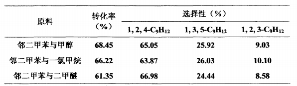 O-xylene is alkylated with methanol, dimethyl ether or methyl chloride to synthesize 1,2,4-trimethylbenzene, using a fixed bed continuous reaction. Reaction conditions: temperature 400°C, liquid mass space velocity 1h-1, o-xylene: methanol or methyl chloride (molar ratio) 1:1, o-xylene: dimethyl ether (molar ratio) 2:1, reaction time is 1 hour, normal pressure. The catalyst is HMCM-22 molecular sieve with SiO2Al2O3=50. The reaction properties of o-xylene alkylation to synthesize 1,2,4-trimethylbenzene are shown in the table below.
