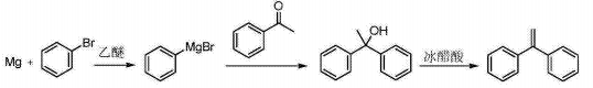 2) CN1651371A reports the synthesis of phenylmagnesium bromide Grignard reagent using bromobenzene as the starting material, iodine as the initiator, and diethyl ether as the solvent at 30 to 35°C, and then dripping the diethyl ether of acetophenone The solution is hydrolyzed by sulfuric acid, recrystallized from ethyl acetate to obtain 1,1-diphenylethanol, and then refluxed and dehydrated in glacial acetic acid to obtain 1,1-diphenylethylene. The reaction process route is as follows: