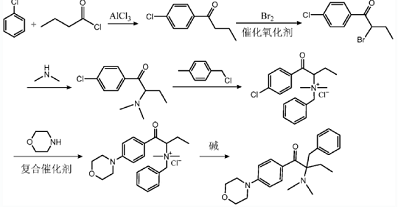 (1) This process uses chlorobenzene as raw material, and finally obtains 369 product through Friedel-Crafts reaction, bromination, dimethylamine substitution of bromine, quaternary ammonium salt synthesis, rearrangement, and morpholine substitution of chlorine. This process seems to have a low production cost, but the process of replacing chlorine with morpholine requires the use of dangerous high-temperature and high-pressure processes, with many by-products and low yields.