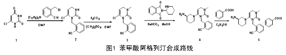 1. Use 6-chloroouracil (industrial grade) and α-bromo-o-methylbenzonitrile as raw materials, DMF as the solvent, and dimethyl sulfate as the methylating reagent. After 4 steps of reaction, 38.09% The total yield of alogliptin benzoate (5) is obtained, and the reaction conditions are simple.