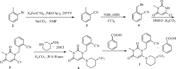 2. Using o-bromotoluene as raw material, alogliptin benzoate is prepared through 5 steps of adding cyano group to non-toxic potassium ferrocyanide, free radical substitution, alkylation, and substitution reaction.