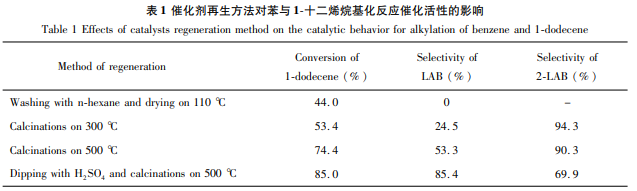 Weigh a certain amount of ZrOCl2·8H2O and dissolve it in an appropriate amount of distilled water to prepare a ZrOCl2 solution. Stir continuously and add a certain amount of TiCl4 (n(Zr)/n(T)=1.5) was slowly dropped into the above ZrOCl2 solution, and 25~28% ammonia was used to adjust the solution to pH=10. The obtained precipitate was aged at room temperature for 24 hours, filtered and washed until there was no Cl –, dried at 110°C for 24 hours and then ground to a particle size of 0.10 mm. Then, according to the ratio of 16g precipitate/100mLH2SO4, immerse it in 1mol/L sulfuric acid solution for 0.5h, filter, wash, dry, and heat at 500℃ Calculate for 3 hours to prepare SO42-/ZrO2-TiO2 catalyst. Add 15mL benzene and 3mL 1-dodecene into a 100mL two-necked flask with magnetic stirring and reflux condenser, then add 0.36g SO42-/ZrO2-TiO2 catalyst, reflux for 3 hours with constant stirring. The influence of the catalyst regeneration method on the synthesis of dodecylbenzene in this reaction is as follows.