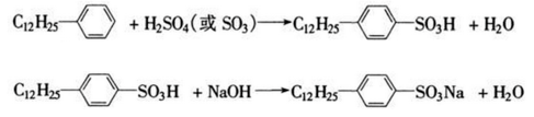 Dodecylbenzene can be used to synthesize dodecylbenzene sulfonate such as sodium dodecylbenzene sulfonate, which is a common anionic surfactant and is widely used in detergents, cleaning agents, etc. By adding 35 mL (34.6 g) of dodecylbenzene into a 250 mL four-neck bottle equipped with a stirrer, thermometer, dropping funnel and reflux condenser, slowly add 35 mL of 98% sulfuric acid under stirring, and the temperature does not exceed 40 ℃, after the addition is completed, the temperature is raised to 60 ~ 70 ℃, and the reaction is carried out for 2 hours. Cool the sulfonation mixture to 40~50℃, slowly add an appropriate amount of water (about 15mL) dropwise, pour it into a separatory funnel, let it stand for a moment, separate the layers, let go of the lower layer (water and inorganic salts), and keep the upper layer (organic phase). ). Prepare 80 mL of 10% mass fraction sodium hydroxide solution, add about 60 to 70 mL of it into a 250 mL four-neck bottle, slowly add the above organic phase dropwise while stirring, control the temperature to 40 to 50°C, and adjust with 10% mass fraction of sodium hydroxide. pH=7~8, and record the total dosage of 10% sodium hydroxide by mass fraction. In the above reaction system, add a small amount of sodium chloride, filter after the permeability circle test is clear, and obtain a white paste product, which is sodium dodecylbenzene sulfonate. The reaction formula is as follows.